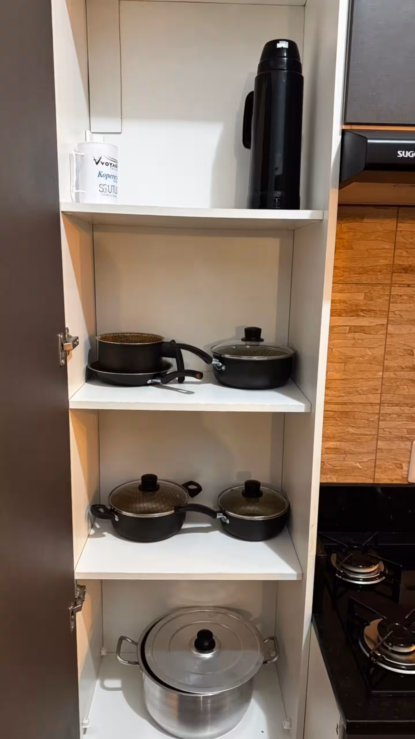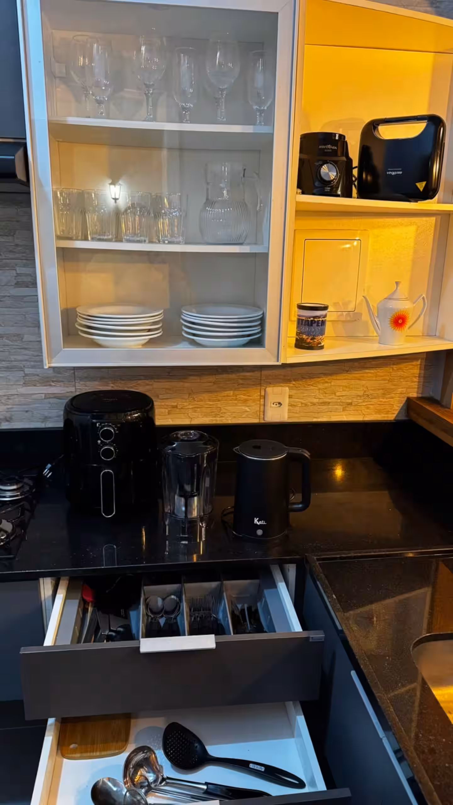 Cozinha comunitária com tudo o que você precisa: geladeira, fogão, Air Fryer, micro-ondas, liquidificador, chaleira elétrica, louças, talheres e muito mais