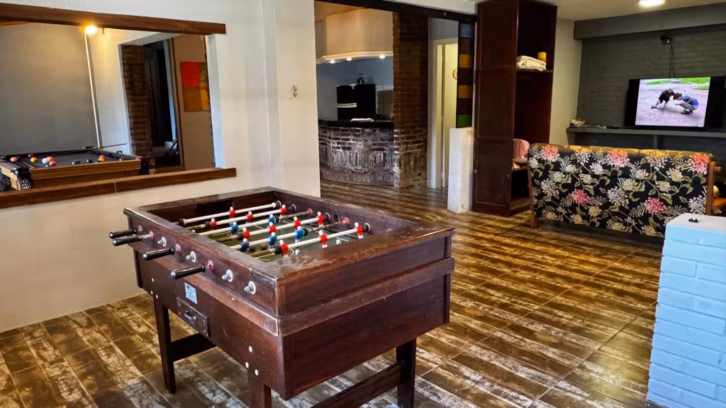 Salão de jogos com lareira, mesa de bilhar e pebolim, sofá, poltronas, TV e som ambiente JBL